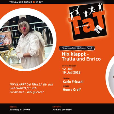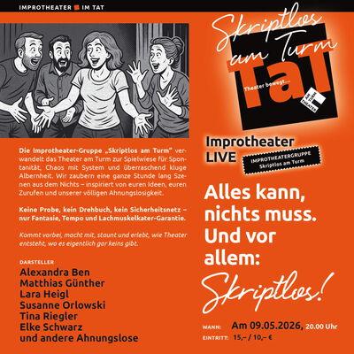 Die Improtheater-Gruppe „Skriptlos am Turm“ verwandelt das Theater am Turm zur Spielwiese für Spontanität, Chaos mit System und überraschend kluger Albernheit. Wir zaubern eine ganze Stunde lang Szenen aus dem Nichts – inspiriert von euren Ideen, euren Zurufen und unserer völligen Ahnungslosigkeit. Keine Probe, kein Drehbuch, kein Sicherheitsnetz nur Fantasie, Tempo und Lachmuskelkater-Garantie. Kommt vorbei, macht mit, staunt und erlebt, wie Theater entsteht, wo es eigentlich gar keins gibt.